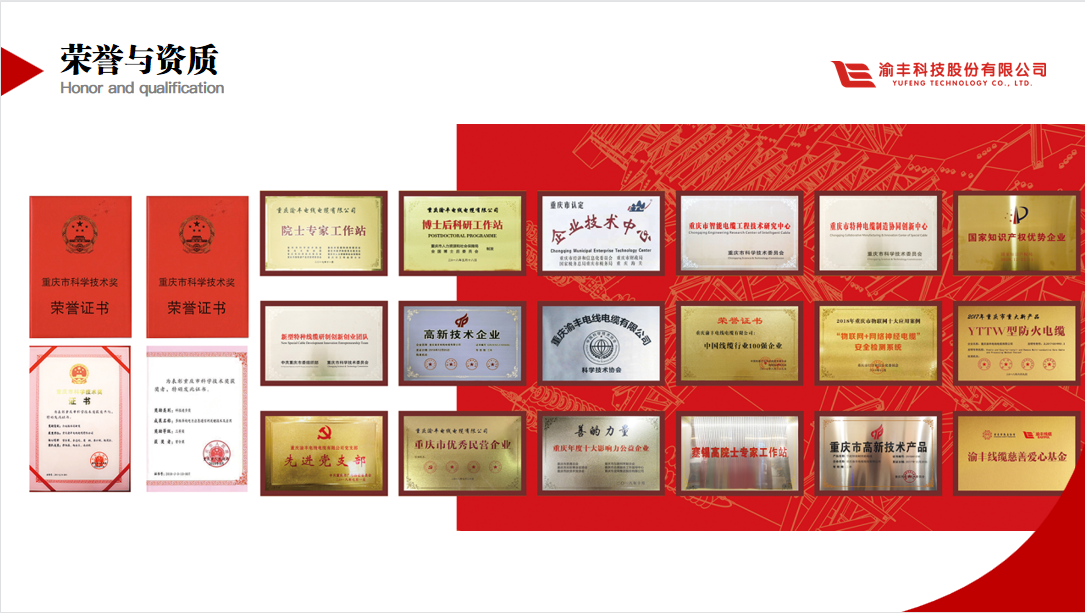 招投标品牌调研公示服务平台于今年3月举办了“2023年度中国电线电缆招标采购评价推介暨遴选优秀诚信供应商”活动,并于近期发布了2023年中国电线电缆招标采购品牌榜单。渝丰科技荣获“2023中国特种电缆十大品牌”、“2023中国最具投标实力电线电缆供应商百强”等多项荣誉。